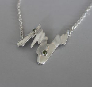 Nordlys anheng har 2 ekte fasettslipte edelstener, her Peridot (grønn) og er montert på ankerkjede. Smykket ligger fint i halsgropen og har en spennende fasong som blir lagt merke til. Smykket er inspirert av det fantastiske nordlyset som flagrer og bølger over den Nord-Norske vinterhimmelen. Nordlyset varierer sterkt i farger og lysstyrke, alltid like fascinerende.